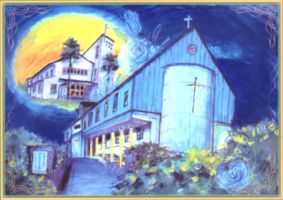 | 1954 | 9月に牧師館が完成。10月に新しい教会堂の定礎式を行い、12月のクリスマス礼拝でオープン。翌年1月に献堂式を挙行しました。木造アルミ葺、一部3階建て、建坪107坪、総工費447万円でした。 子供聖歌隊が発足し、子供図書館も始めました。 ![]() |
